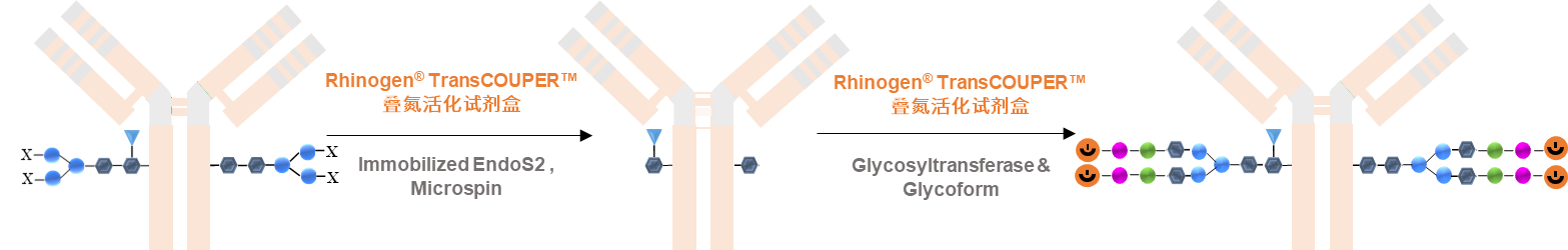 通過(guò) LC-MS 測(cè)定,Rhinogen? TransCOUPER? 疊氮活化試劑盒對(duì) 100 μg 人 IgG1 的轉(zhuǎn)糖基化率 ≥ 95%。