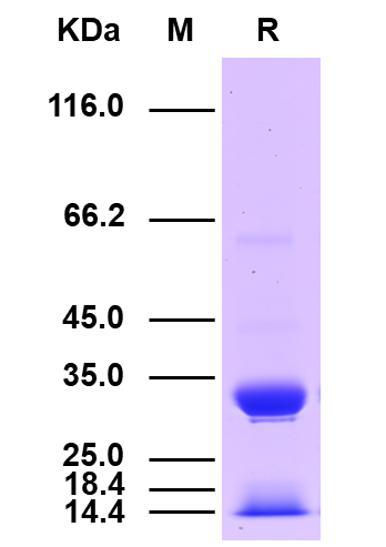 理論分子量為32.3kDa和12.8kDa,由于糖基化,SDS-PAGE還原電泳分子量大小為32-35kDa和14kDa。