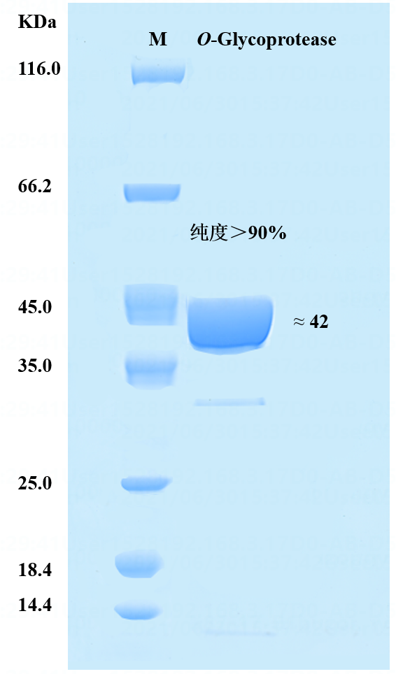 O-糖蛋白酶(O-Glycoprotease)重組表達于E.coli,C端帶6×His標簽。O-糖蛋白酶是一種O-糖蛋白特異性內切蛋白酶,可催化天然黏蛋白型O-糖基化蛋白中與O-聚體直接相鄰的肽鍵的水解。