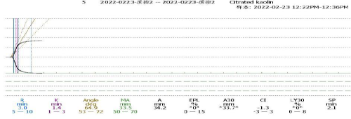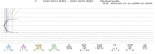 3.0min<血凝時間(R);1.0min<血塊形成時間(K)<3.0min;55°<血凝速率(Angle)<76°、25mm<血塊強度<45mm。