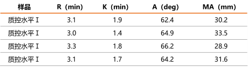 使用血栓彈力圖儀平行進行三次質(zhì)控品檢測,其關(guān)鍵參數(shù)如R、K、A、MA值的重復(fù)性好,可以作為該設(shè)備通道的校準品使用。