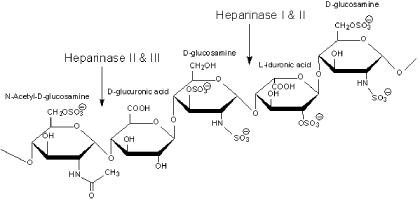 肝素酶(heparinase)是一類(lèi)作用于肝素或者乙酰肝素分子的多糖裂解酶,編號(hào)為EC 4.2.2.。廣義上的肝素酶既包括微生物產(chǎn)生的以裂解方式降解肝素或硫酸乙酰肝素的酶類(lèi),又包括動(dòng)物體內(nèi)產(chǎn)生的以水解方式降解硫酸乙酰肝素的內(nèi)源性(類(lèi))肝素酶(heparanase)。酶降解法中的肝素酶產(chǎn)品來(lái)源主要是肝素黃桿菌(Flavobacterium heparinum)中肝素酶的分離純化,仍然是商品肝素酶的唯一來(lái)源。已從肝素黃桿菌中分離純化出的肝素酶有三種,分別為肝素酶I、II、III,這三種酶的酶學(xué)特性各不相同。
