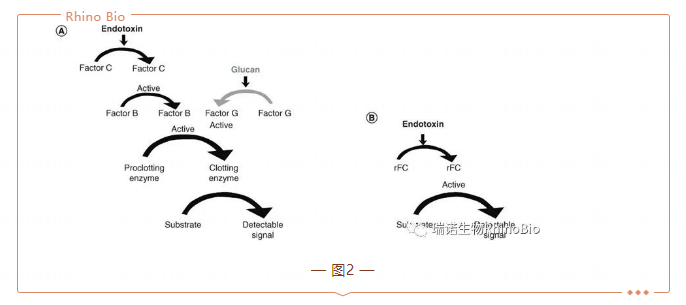 基于鱟變形細胞裂解物(LAL)的內(nèi)毒素檢測于1977年被美國FDA批準,之后幾年陸續(xù)被其他主流藥典批準。在藥物質(zhì)量控制中,有三種主要的LAL方法用于檢測和/或定量內(nèi)毒素,根據(jù)它們的檢測機制命名。雖然它們是不同的方法,但它們都利用鱟試劑來檢測內(nèi)毒素,并依賴于相同的凝血級聯(lián)原理(圖2)。凝膠法是最原始的鱟試驗,也是目前藥典認可內(nèi)毒素檢測的“金標準”。這是一種定性檢測方法,其中凝膠的凝結(jié)表明樣品中存在高于裂解物靈敏度的內(nèi)毒素。其他兩種方法,比濁法和顯色法,都是通過標準曲線實現(xiàn)定量分析。比濁法LAL測試將凝膠化速率(濁度)聯(lián)系起來,以確定樣品的內(nèi)毒素濃度。顯色LAL測試使用一種合成顯色底物,該底物添加到試劑中并被凝血酶激活,從而產(chǎn)生比色讀數(shù)。