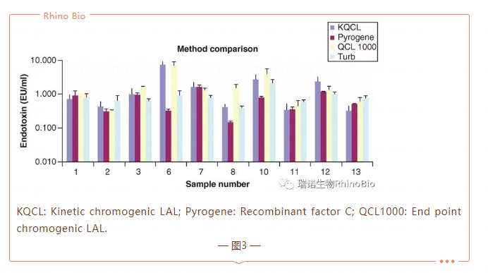 由于潛在的干擾,蛋白質(zhì)樣品中內(nèi)毒素的檢測可能具有挑戰(zhàn)性。輝瑞公司2013年利用所有市售鱟試劑測試方法(凝膠法、動力學比濁法、動力學顯色和終點顯色)以及rFC檢測了13個具有代表性的生物蛋白質(zhì)樣品(圖3)。在所有定量分析中,10個樣品的內(nèi)毒素水平都可測量,rFC和LAL之間的檢測結(jié)果差異不大。