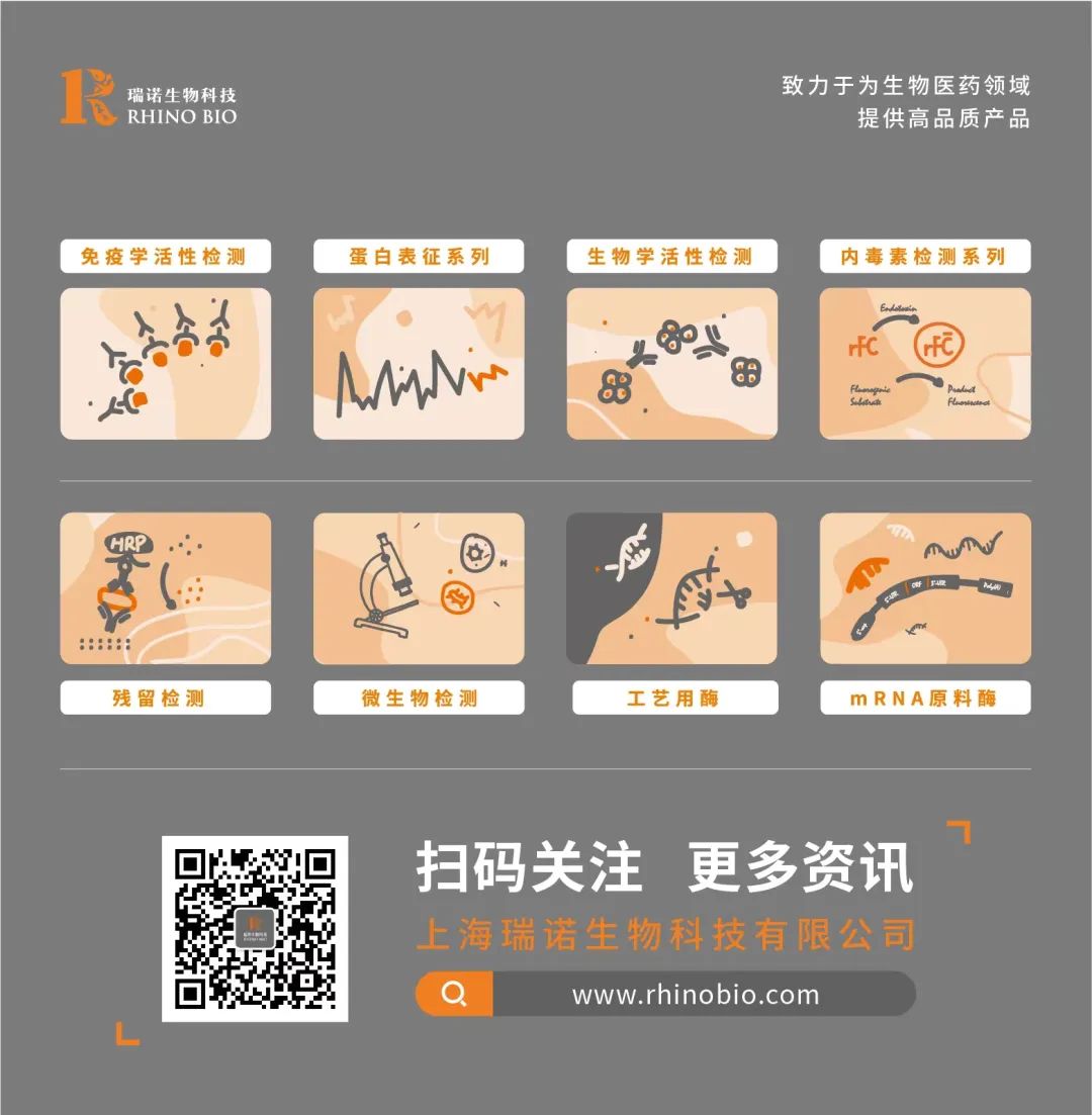上海瑞諾生物科技有限公司/蘇州瑞特佰生物科技有限公司(RhinoBio),專注于生物醫(yī)藥研發(fā)及質(zhì)量控制相關配套試劑的研發(fā)和生產(chǎn),致力于為生物制藥領域提供高品質(zhì)的產(chǎn)品。公司現(xiàn)有重組C因子內(nèi)毒素檢測試劑盒和重組鱟試劑內(nèi)毒素檢測試劑盒、蛋白表征相關糖苷酶和蛋白酶、殘留檢測試劑盒、支原體檢測試劑盒及生物學活性檢測試劑等眾多產(chǎn)品,旗下“Rhinogen”系列產(chǎn)品已服務數(shù)百家生物醫(yī)藥公司、CRO公司、CDMO公司及高校,是生物分析領域的專業(yè)供應商。